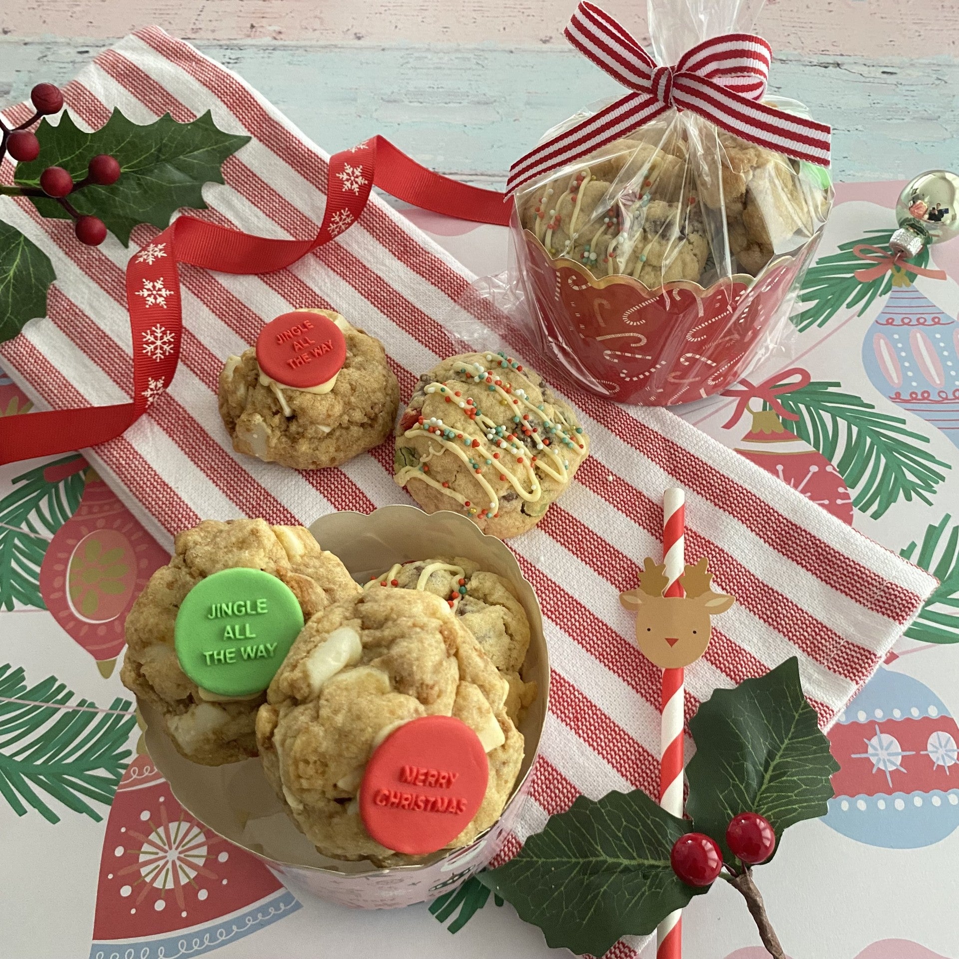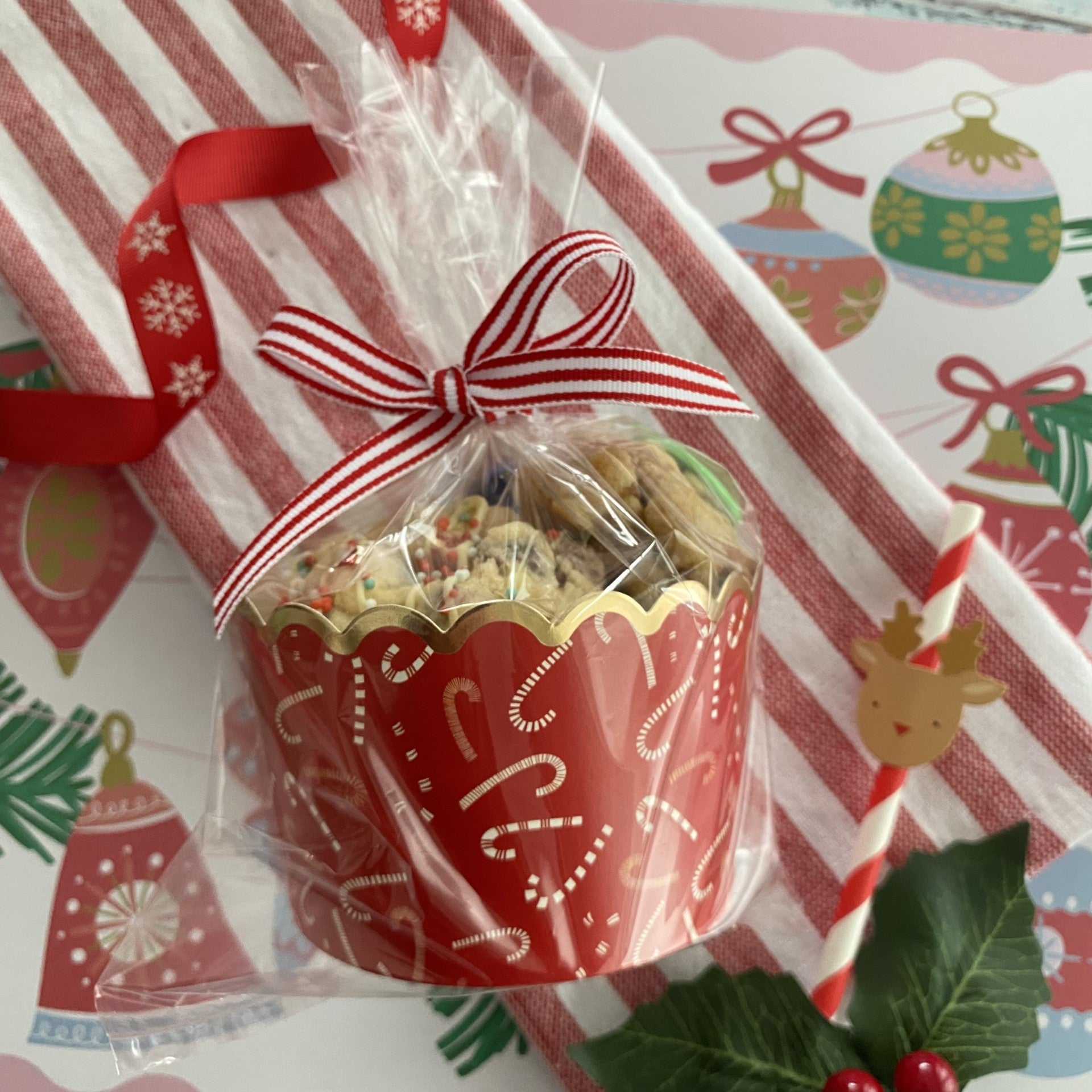 Cookies are individually heat sealed and presented in a cellophaned Christmas Cup tied with matching ribbon.